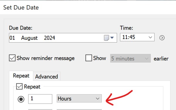 From the note's menu you can go to the Due date option and choose the repeat option like below.