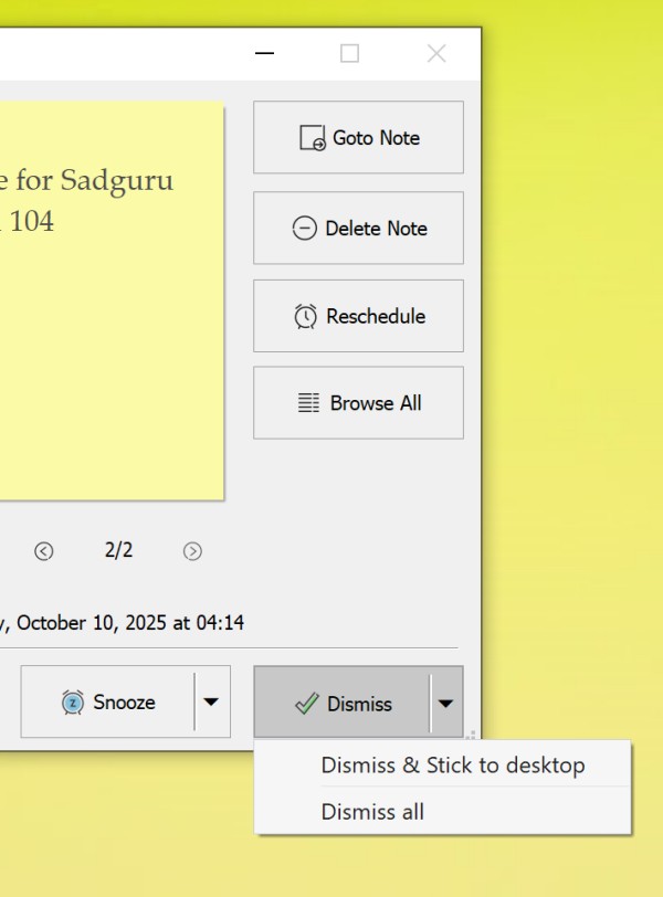 When an alarm goes off you will see the below pop up window. The note will appear inside this popup window. Here you have an option to Dismiss and stick to desktop. So when dismissing, you can stick a note to the desktop. Next you can go to the desktop sticky note and press Ctrl+Q to make it stay always on top of other apps.