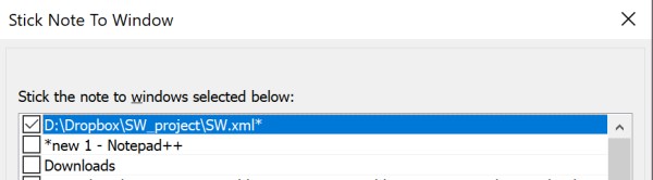 To allow this title also, go to the sticky note when it is visible and go to the "Stick to window" option and edit the title and add an asterisk (*) at the end like shown in the below screenshot.