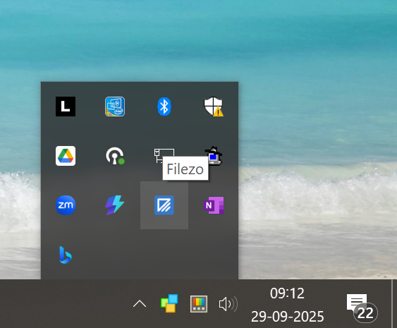 - Look for Filezo icon in the notification area of the Windows Taskbar (as shown below) and click on it.