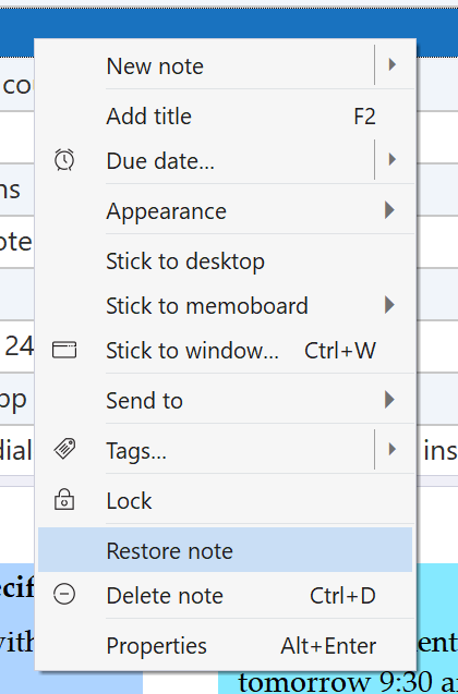 On Windows, you can go to Notes Browser, then go to Trash memoboard, and click on Restore note option: