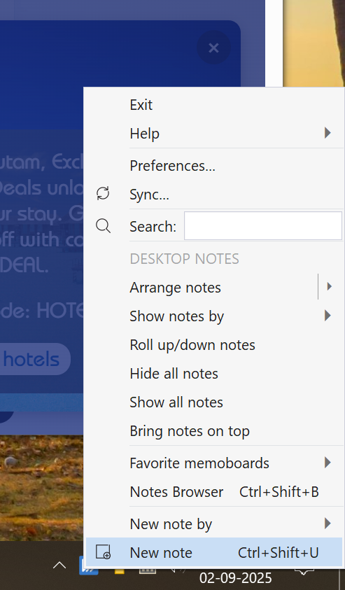 You can also mark a memoboard as favorite and use the Favorite memoboard from below menu. Right click on  Notezilla  icon (next to the clock)  in the taskbar  and select Notes Browser or Favorite memoboard option from the menu